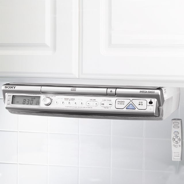 Under Kitchen Cabinet Mounted Stereo. This space saving feature also protects an under cabinet radio from accidents caused by knocking it over or getting something tangled in the cord. They typically mount underneath the bottom of cabinets or cupboards in the kitchen.